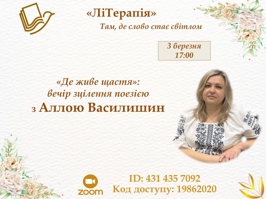 Гостя події – Алла Василишин – поетка і людина, яка надихає інших знаходити власний голос, відчувати глибше й жити чуттєвіше. Її слово – щире, тепле, живе. Її поезія – про нас і для нас.