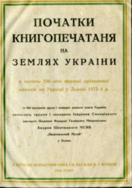 Свєнціцький І. Початки книгопечатання на землях України (1924р.). Фото : вебсайт Львівська національна наукова бібліотека України ім. В. Стефаника