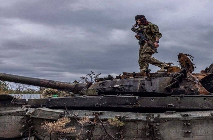 Українська військова під час огляду знищеного танку рашистів. Фото: Українки