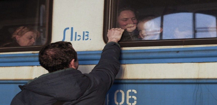 Чоловік на пероні прощається з дружиною та сином на вокзалі 14 березня 2022 року. Фото: Getty Images