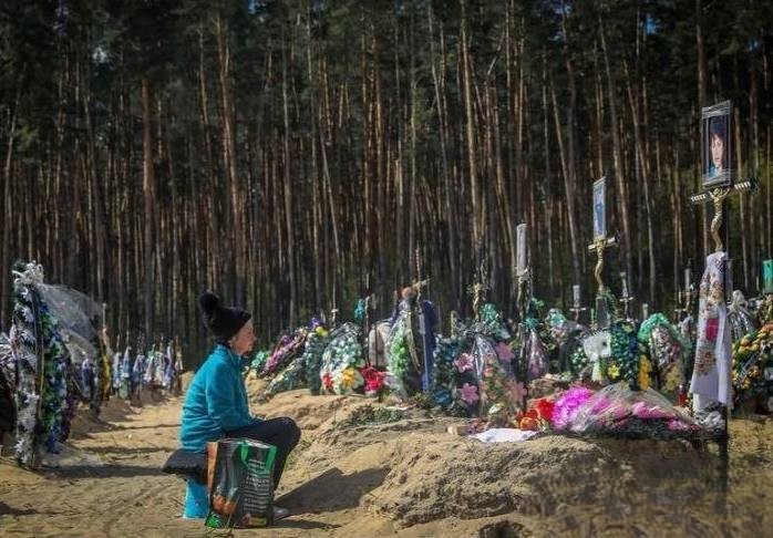 Жінка біля могили вбитої родини в Ірпені, похованої серед жертв російського геноциду. Фото: РУБРИКА